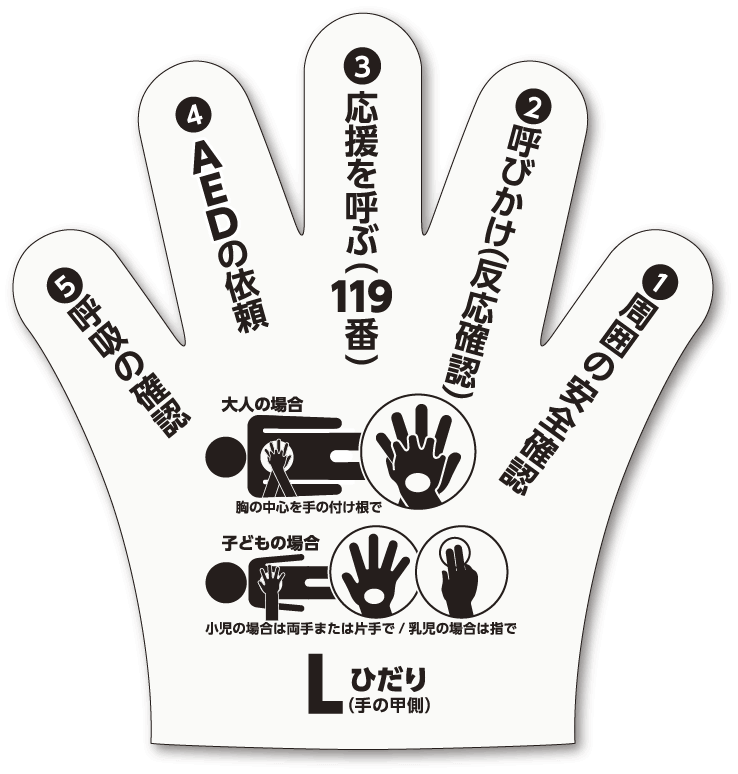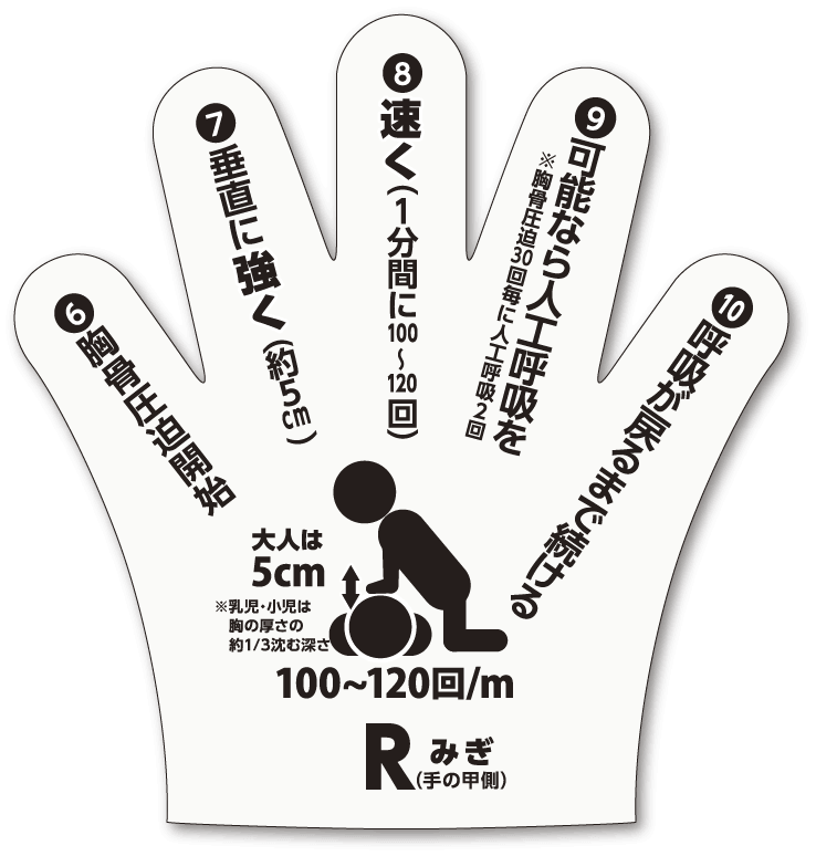 手袋の印刷面が左右とも手の甲側になるよう着用し、手順を確認しながら心肺蘇生を行ってください。