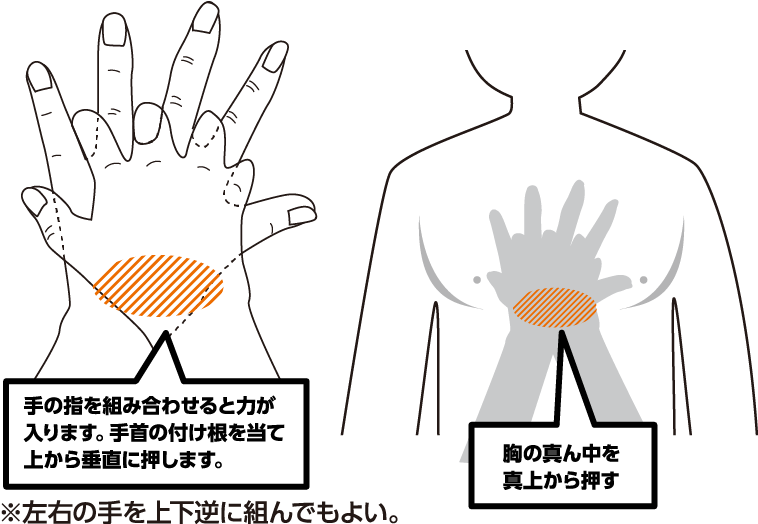 胸骨圧迫(心臓マッサージ)は手を使って行う。