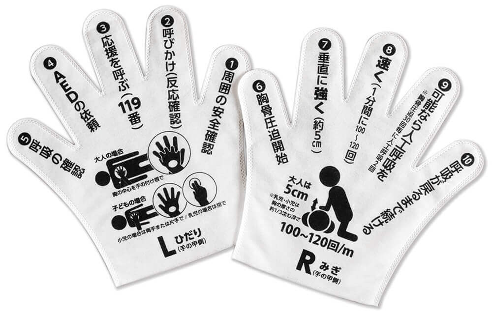 傷病者(意識を失った人)に遭遇することを想定し、「心肺蘇生手袋」をはめ、記載の手順にそって具体的に学ぶことができ、わかりやすくかつ記憶に残りやすい指導の一助となり、正しい心臓マッサージを学ぶことができる。